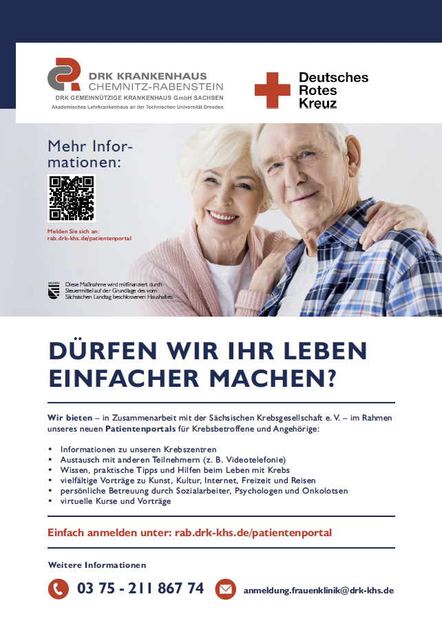 Zusammen mit Partnern hat die Sächsische Krebsgesellschaft e.V. für Betroffene, Angehörige und Zugehörigen dafür nun ein neues Angebot bereitgestellt. Die mit Steuermitteln auf der Grundlage des vom Sächsischen Landtag geschlossenen Haushaltes wurde mit Betroffenen und professionellen Unterstützern aus der Onkologie entwickelt und getestet. Ab sofort kann sie nun von allen interessierten Patienten der Krebszentren des DRK Krankenhauses Chemnitz-Rabenstein, ihren Angehörigen oder Zugehörigen genutzt werden.